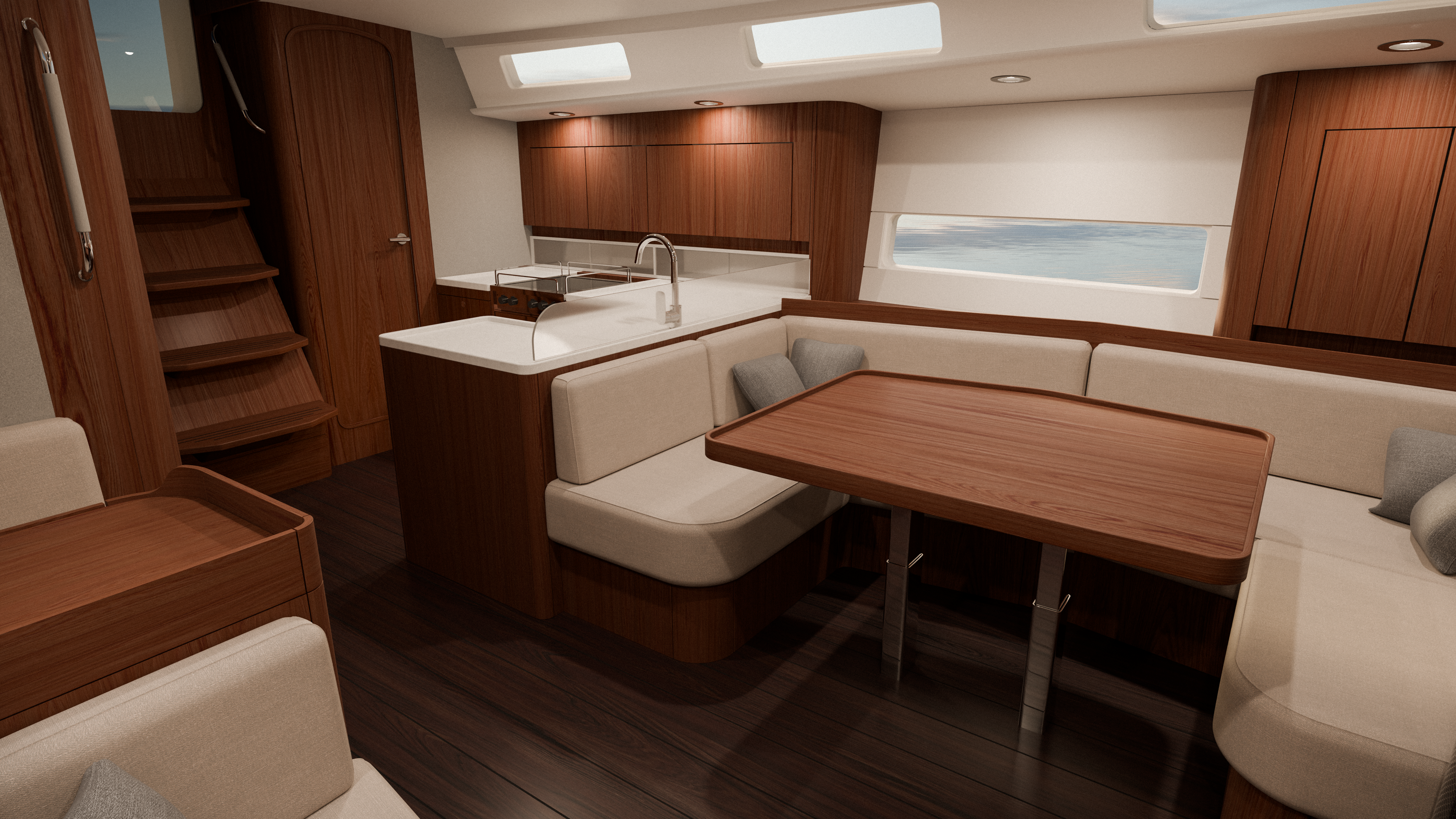 On deck, the exterior has been subtly refreshed with new hull windows, improving natural light below deck and contributing to a clean, modern appearance. The deck layout has been refined with an integrated bowsprit, an optional swim platform, and new helm pedestals derived from the award-winning Arcona 50, enhancing ergonomics and usability.